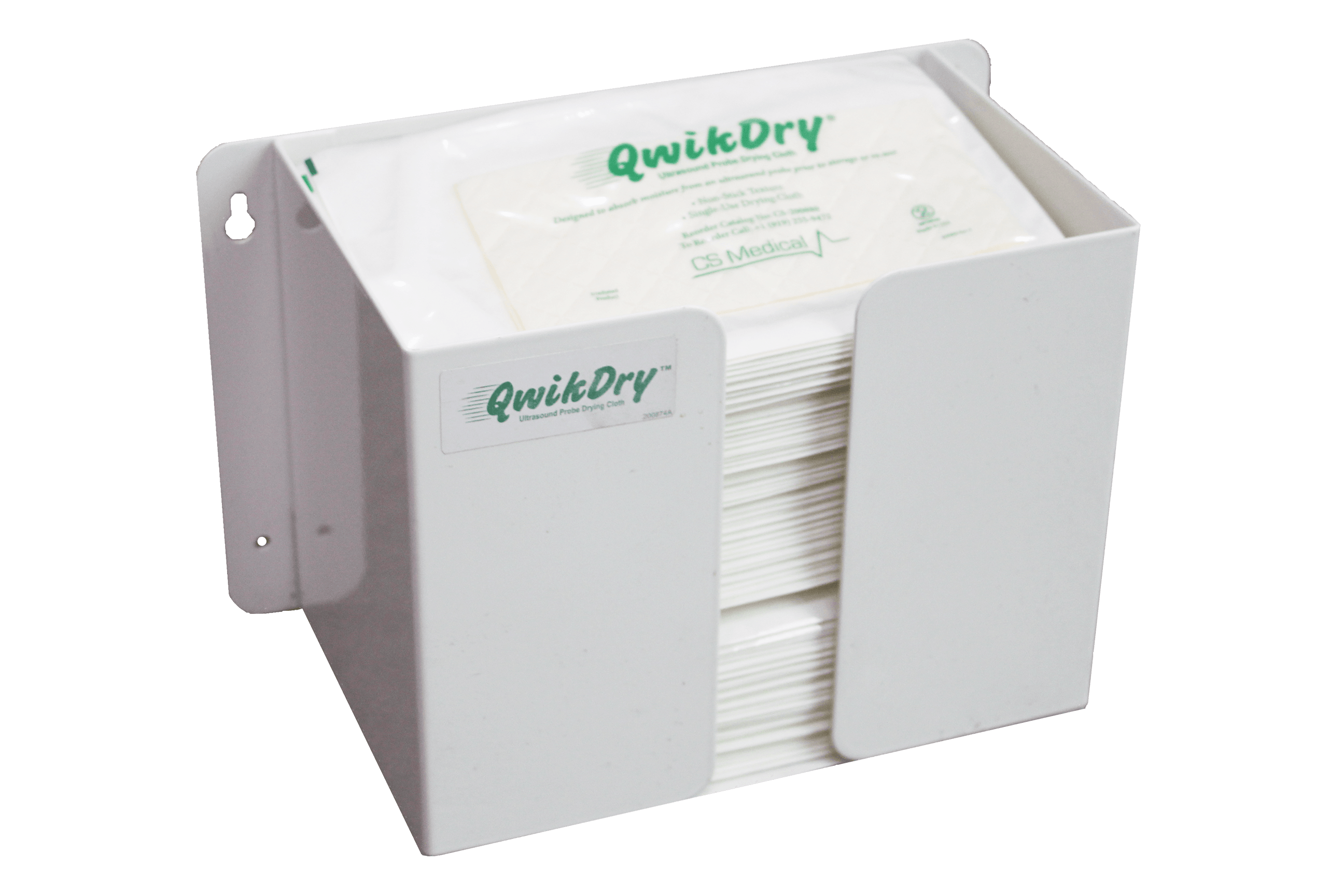 The caddy is designed to mount directly to a wall or other flat surface near the point of use. The QwikDry caddy is constructed of powder coated metal and holds 100 individually packaged chevron pouches. The caddy allows for simple dispensing of the QwikDry cloths while giving valuable counter or table top space back to the high-level disinfection area.