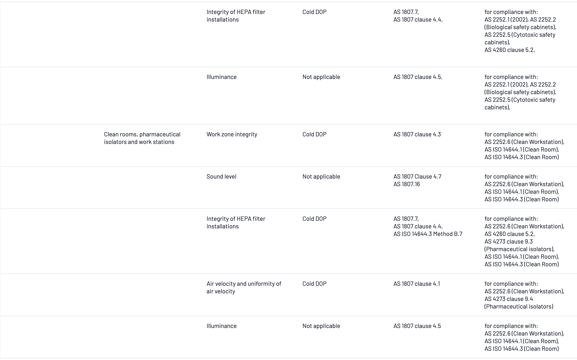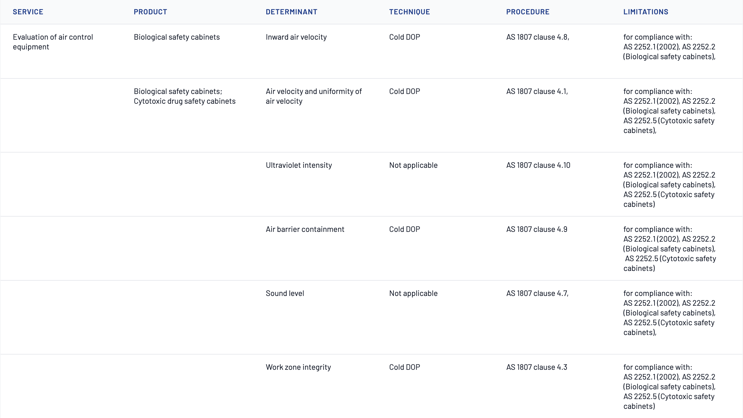 AMT Group is NATA accredited (NATA Number 20596) and offers testing services across Australia. We are certified to evaluate air control equipment, specialising in laboratory, pharmaceutical and hospital industries. Equipment including biological safety cabinets, Cytotoxic drug safety cabinets, clean rooms, pharmaceutical isolators and work stations, fume cupboards and recirculating fume cabinets.